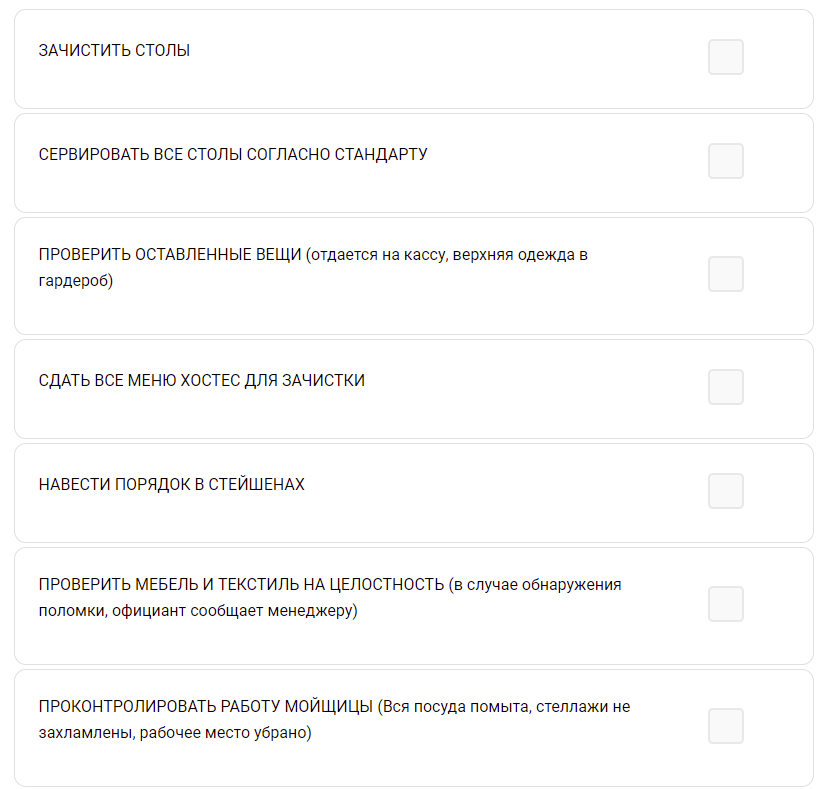 Возьмём, к примеру, закрытие смены в ресторане. Работнику нужно выполнить множество действий и не забыть ни про одно из них, чтобы сделать всё корректно.