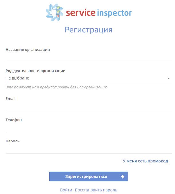 От вас требуется указать название организации, выбрать её род деятельности, почту, пароль и всё такое. В зависимости от выбранного типа сервис предложит определённый шаблон чек-листов.