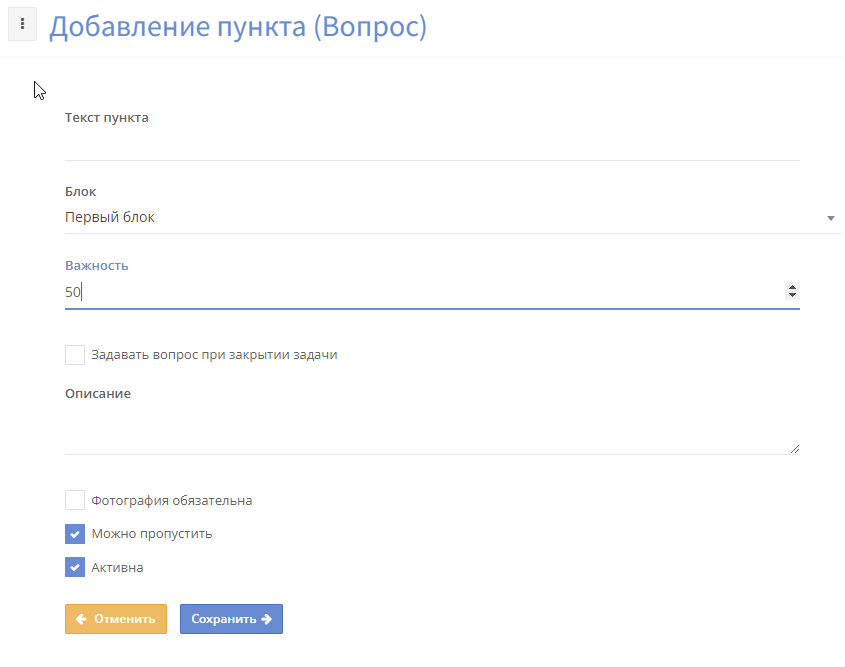 В зависимости от выбранного типа немного меняются параметры, доступные для настроек. Вы можете выбрать, в какой блок добавить задачу, выставить у неё приоритет, задать описание. В случае с вопросом — его можно задать в конце заполнения чек-листа. А слайдер может потребовать добавление фотографии.