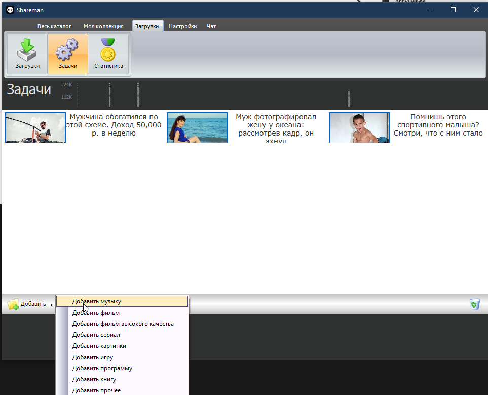 Для того чтобы загрузить свои файлы, придётся зарегистрироваться в Shareman. Для этого в разделе Загрузки нужно нажать кнопку Добавитьи выбрать необходимый раздел: музыка, фильмы, книги и тому подобное.