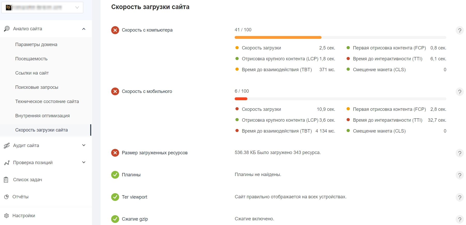 Скорость загрузки сервис считает по современному стандарту — Core Web Vitals от Google. Для этой оценки качества сайта важно, как проходят этапы загрузки: отрисовка первого элемента контента, сдвиг макета, реакция страницы на первое действие пользователя. Для каждого показателя есть своя оценка.