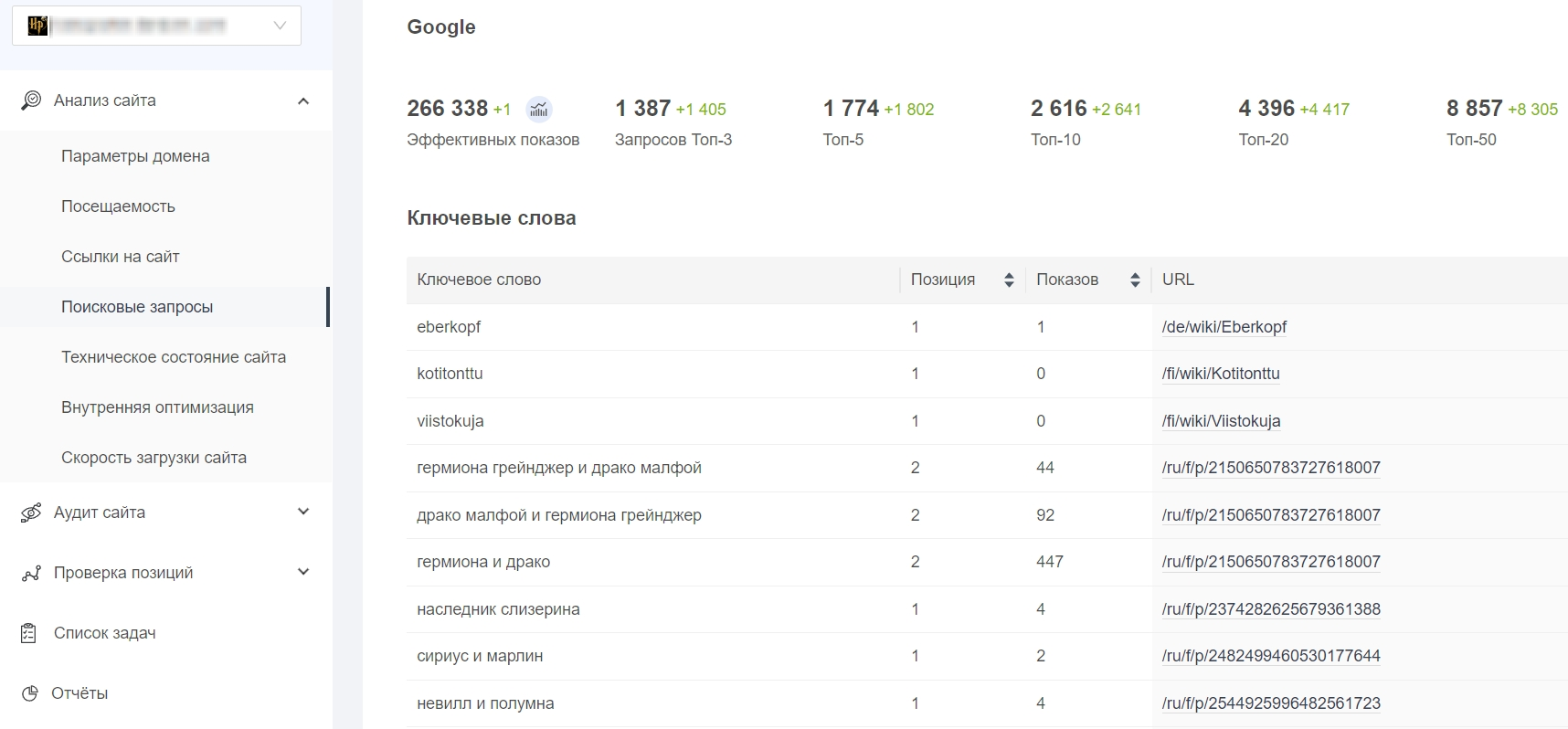 Сервис отслеживает, как меняется ранжирование сайта в выдаче Google и Яндекс. Данные отображаются по нужным вам регионам и устройствам за конкретный период.