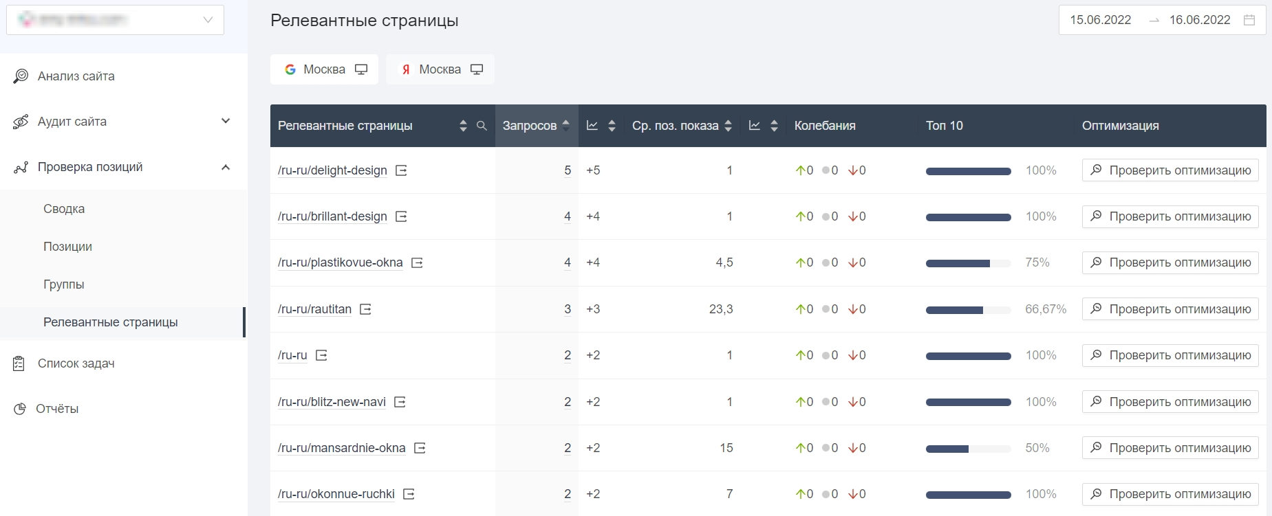 Раздел «Релевантные страницы» показывает данные с фокусом на URL сайта: у них указано количество запросов, средняя позиция и рост/падение. Сразу можно перейти к проверке оптимизации этой конкретной страницы, это бесплатно.