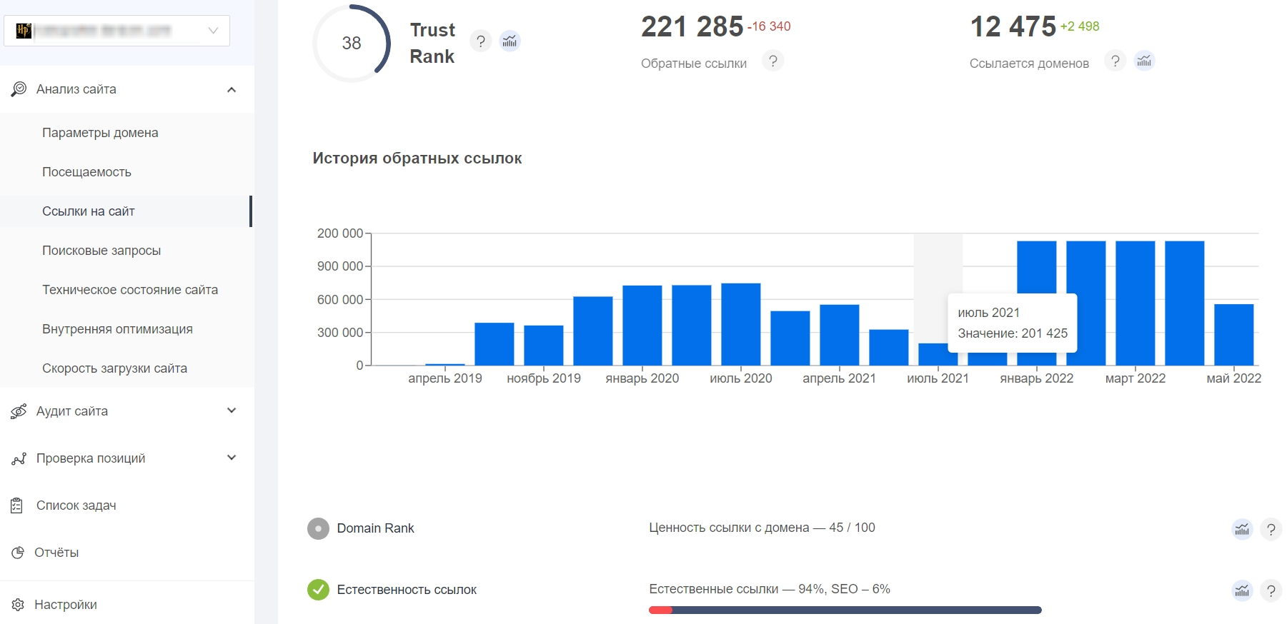 Сервис анализирует ссылочный профиль: собирает информацию о входящих ссылках со сторонних доменов, отображает динамику, а новые ссылки выводит в списке с анкорами. По анкорам определит соотношение естественных и покупных ссылок. Это важно знать при планировании ссылочной стратегии, естественных должно быть больше.