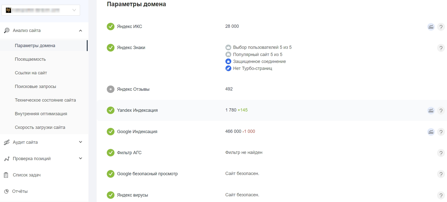 Модуль содержит несколько разделов с тестами. В параметрах домена можно узнать ИКС, доступные Знаки Яндекса, категорию сайта, блокировку РКН, вирусы, количество отзывов, а также посмотреть график индексирования страниц в Яндексе и Google.