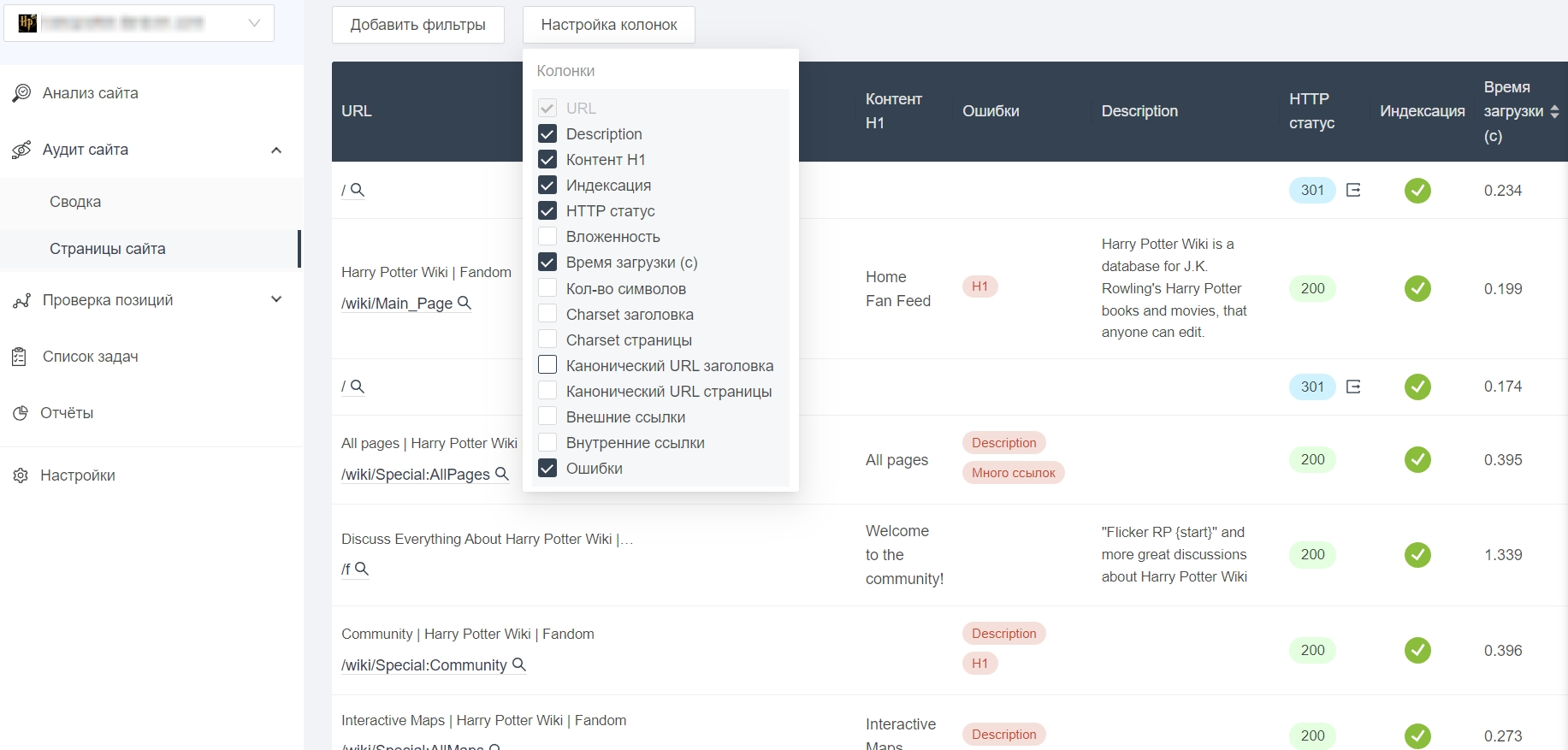В разделе «Страницы сайта» настроена система для поиска страниц с конкретными ошибками. В фильтрах есть перечень условий, например, «ошибки в h1», «страницы, закрытые от индексации», «title равен…». Можно настроить вид результатов, добавив интересующие колонки с данными по страницам.
