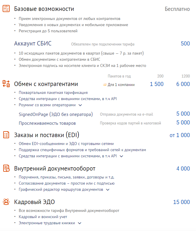 В сервисе есть 4 основных тарифа: на квартал, год, два и три года. В основном пакете учтены базовые функции. Для продвинутых пользователей есть ряд дополнительных функций: обмен с контрагентами, заказы и поставки — 1000 руб., внутренний документооборот — 4000 руб., кадровый ЭДО — 4500 руб.