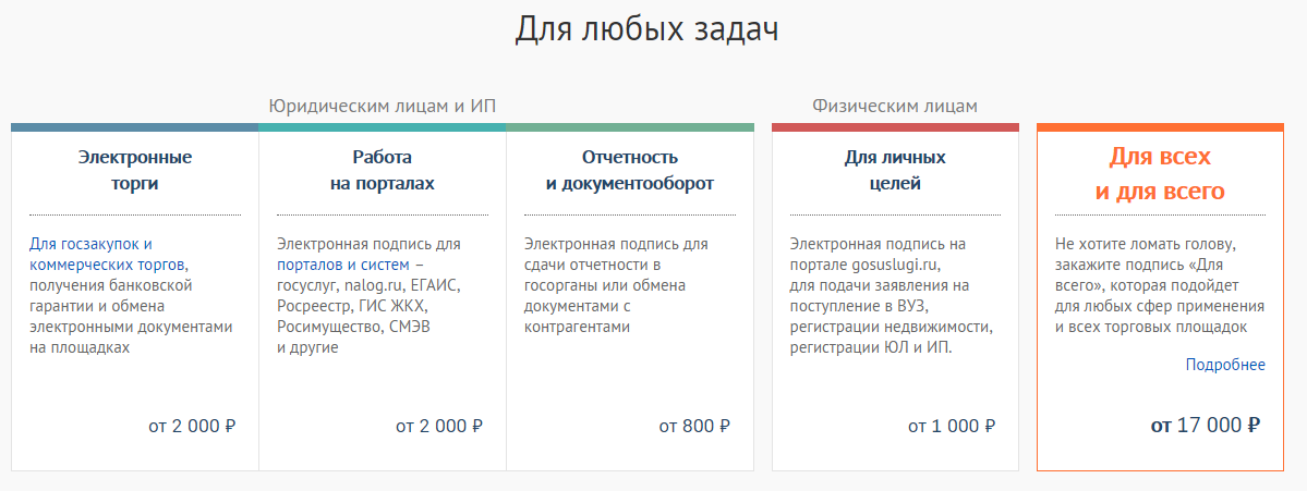 А если электронная подпись понадобилась для многоцелевого использования, можно воспользоваться тарифом «Для всех и для всего» с подписью, которую можно применять во всех сферах и на всех торговых площадках.