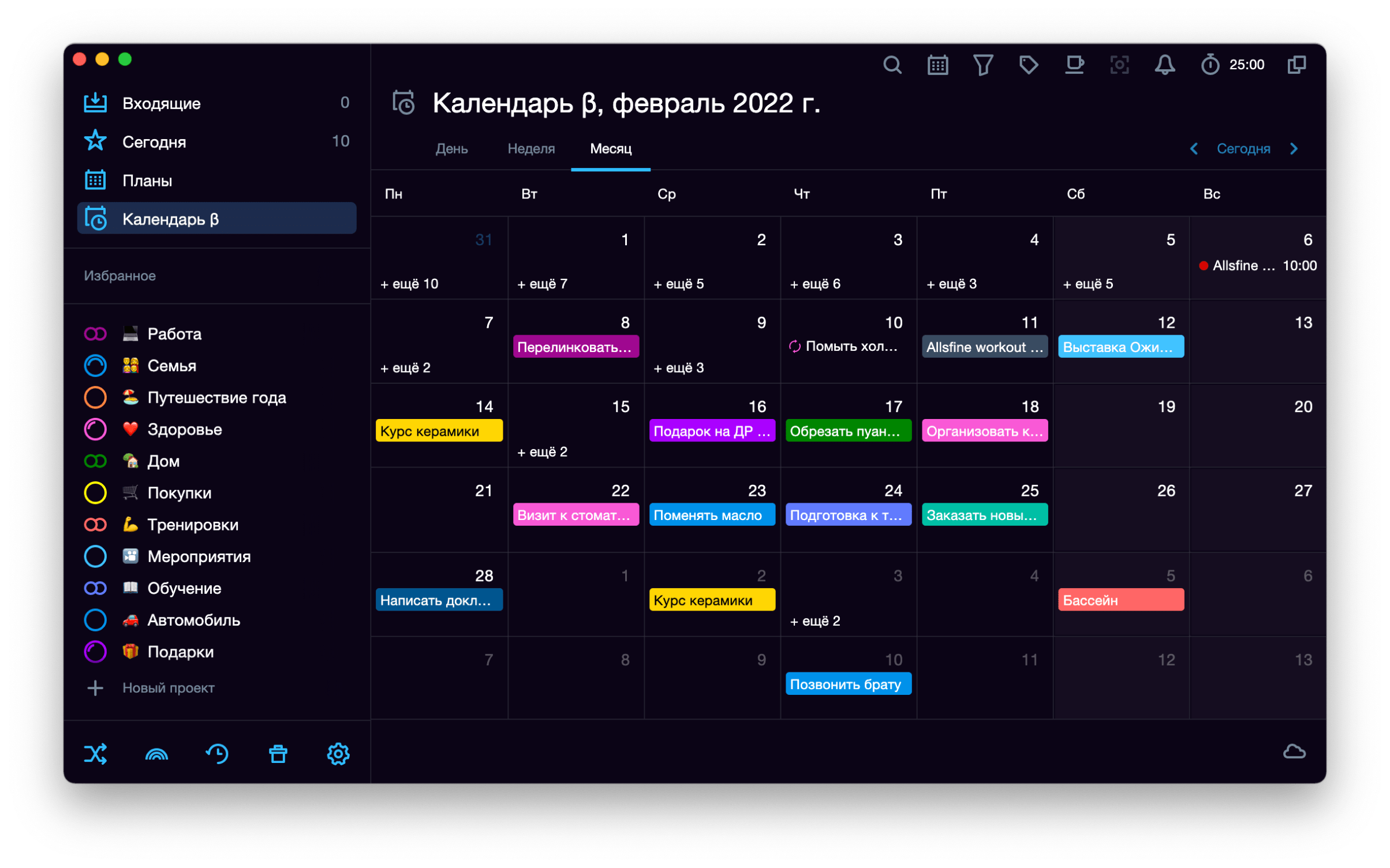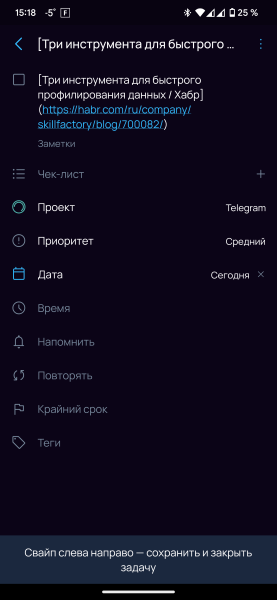 - Задачи можно добавлять в проекты, составлять планы или чек-листы. К ним можно добавлять приоритеты, напоминания, pomodoro-таймеры, реакции и уведомления (в том числе с режимом будильника). Есть поддержка повторяющихся задач.