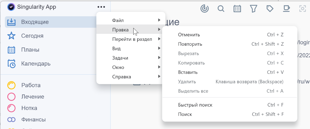 Управляться с SingularityApp можно привычным переходом через разделы в приложении, а можно через выпадающие меню или горячие клавиши. Поэтому можно выбрать наиболее удобный стиль навигации для себя.