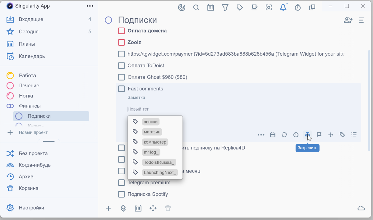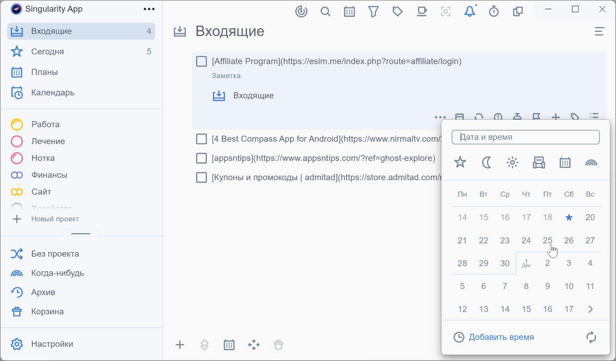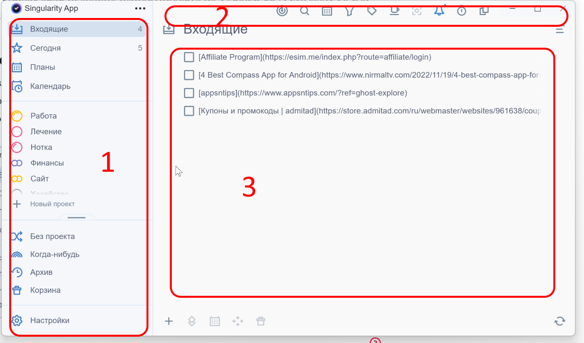 Принцип работы с SingularityApp будет знаком тем, кто уже давно пользуется подобными приложениями. У вас есть привычная папка «Входящие», разделение по проектам, теги, метки и прочие свисточки.