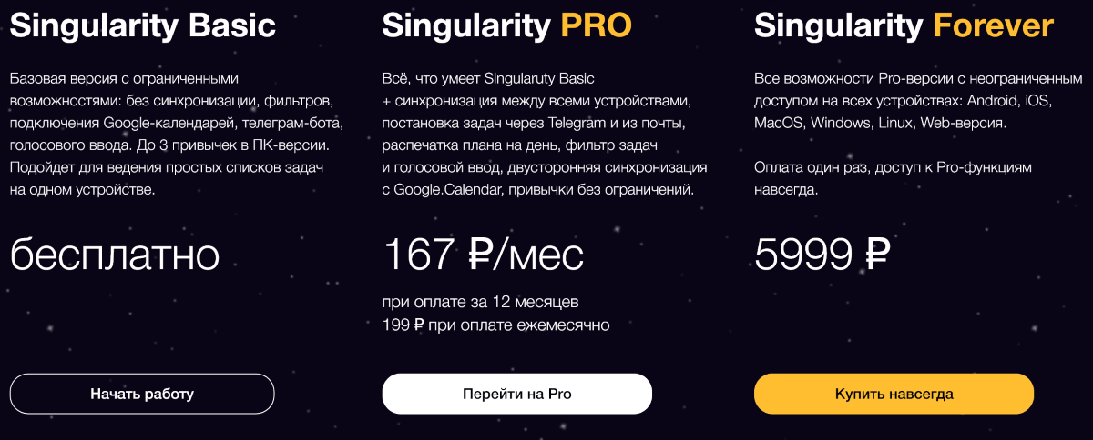 Есть три тарифных плана: бесплатный, Pro за 167 рублей в месяц, Forever с разовой оплатой в 5 999 рублей. По промокоду themarfa можно получить два допольнительных месяца при оплате тарифа на год.