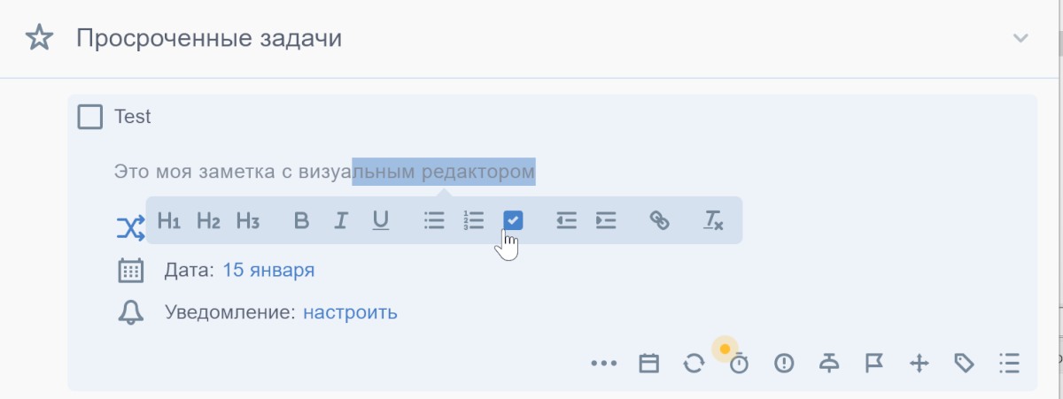 На всех платформах доступен визуальный редактор заметок в задачах. По возможностям, конечно, он уступает полноценным заметочникам, но для менеджера задача здесь есть все необходимые возможности.