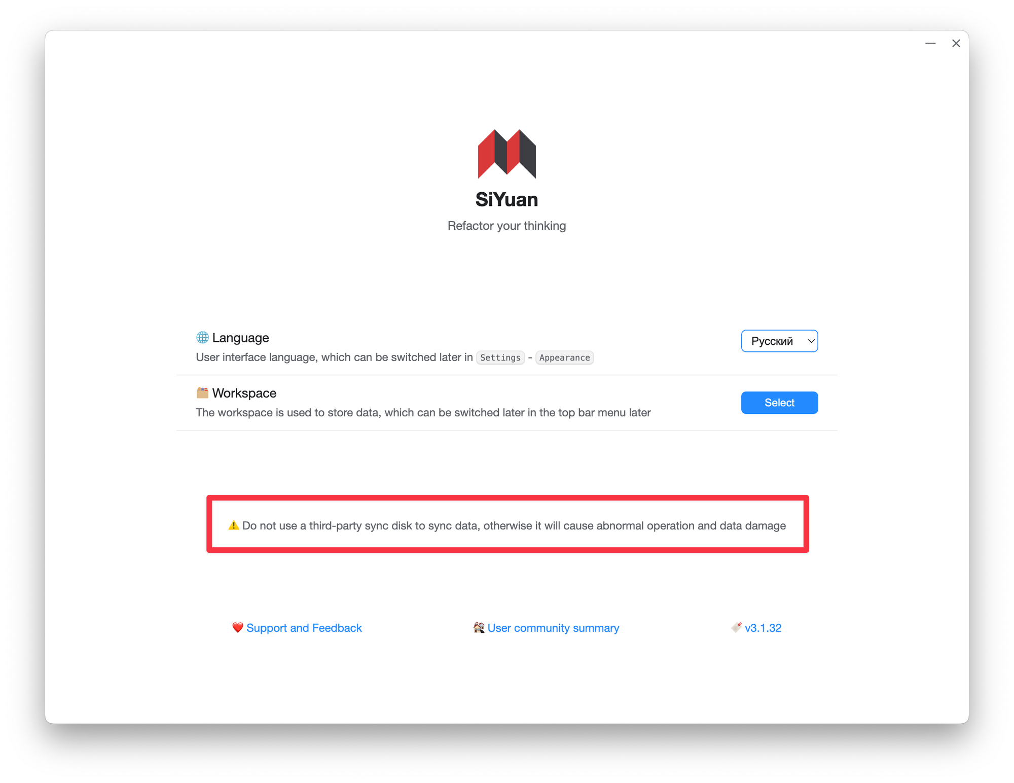 Пользователи Obsidian при первом запуске SiYuan увидят знакомый экран с возможностью выбора языка (есть русский) и папки для хранения данных.