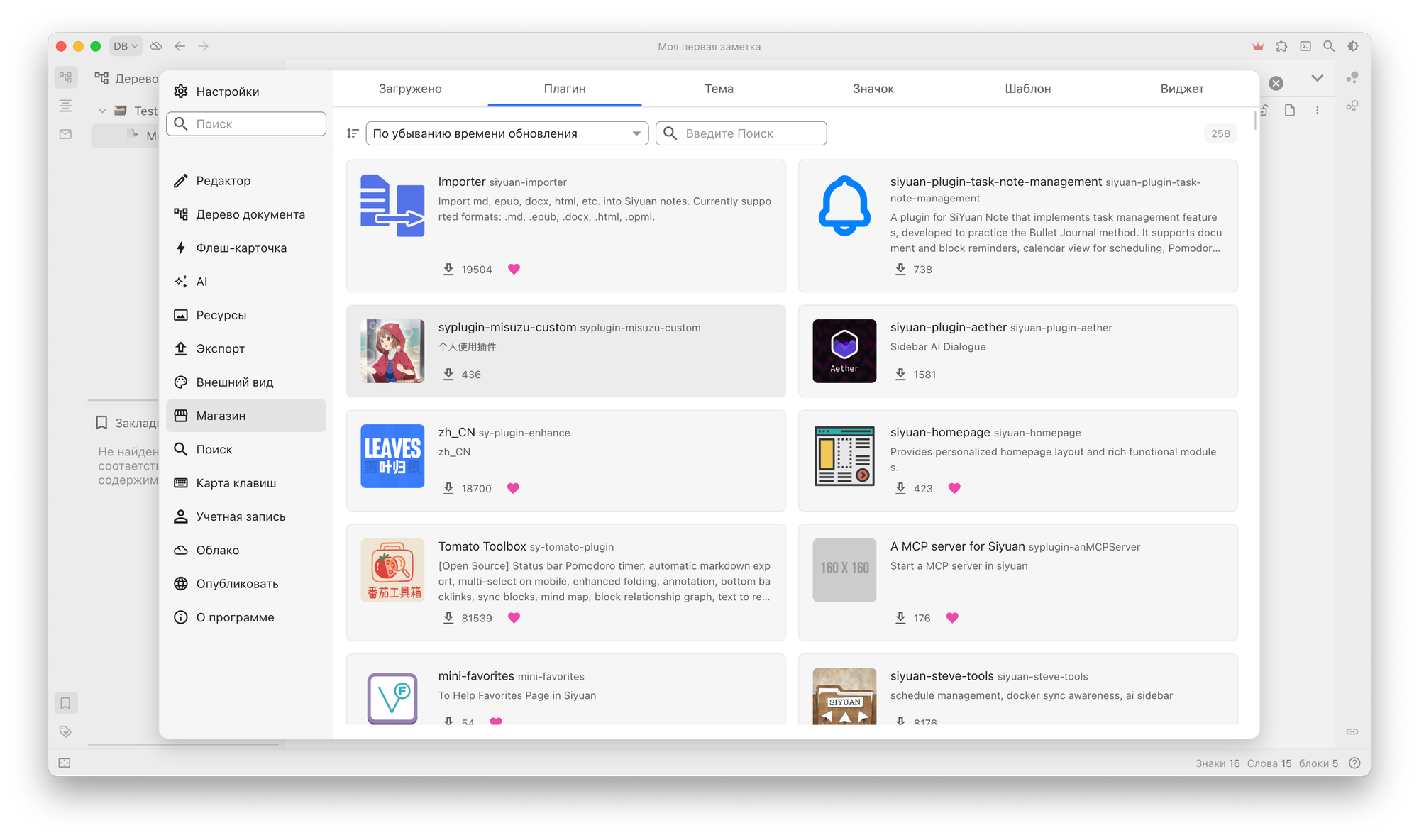 Возможно, дефолтных возможностей SiYuan вам будет недостаточно. В таком случае можно воспользоваться плагинами, темами или шаблонами от сообщества.