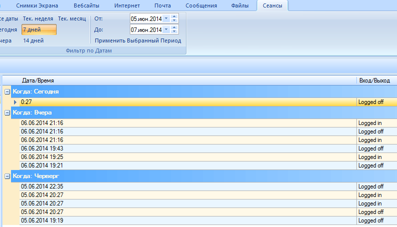 На этой вкладке можно просмотреть когда какой пользователь пользовался компьютером.