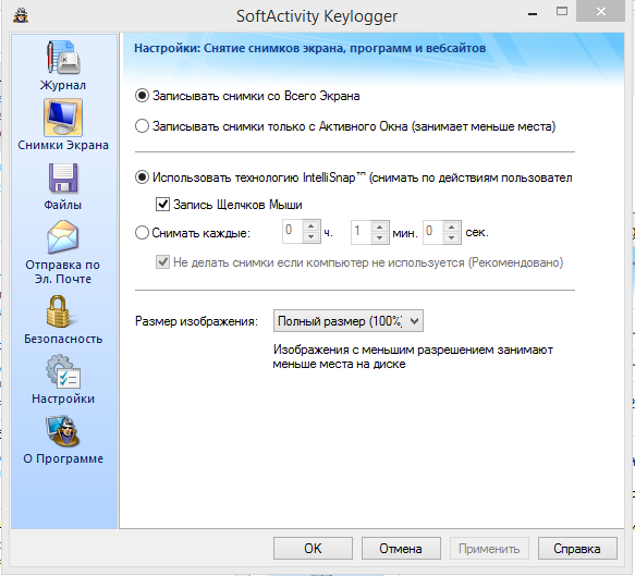 Снимки экрана можно делать по таймеру или по пользовательской активности. Так же, я рекомендую поставить радио-баттон Записывать снимки со Всего экрана. Т.к. снимок активного окна на самом деле снимает лишь часть активного окна.