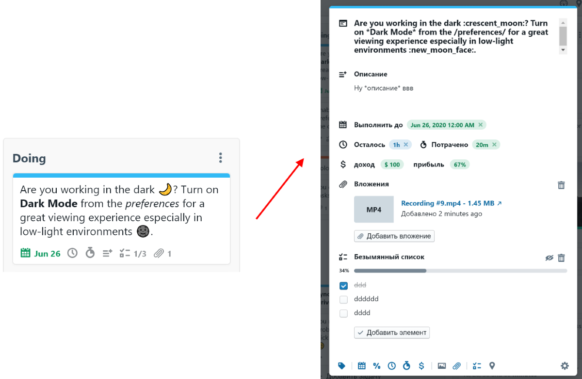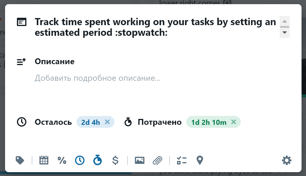 Чтобы увидеть описание, вложения, списки и прочие элементы задачи, придётся дважды кликнуть на карточку и перейти в редактирование. Иначе вы будете видеть лишь иконки, указывающие на то, что у задачи есть дополнительные элементы.