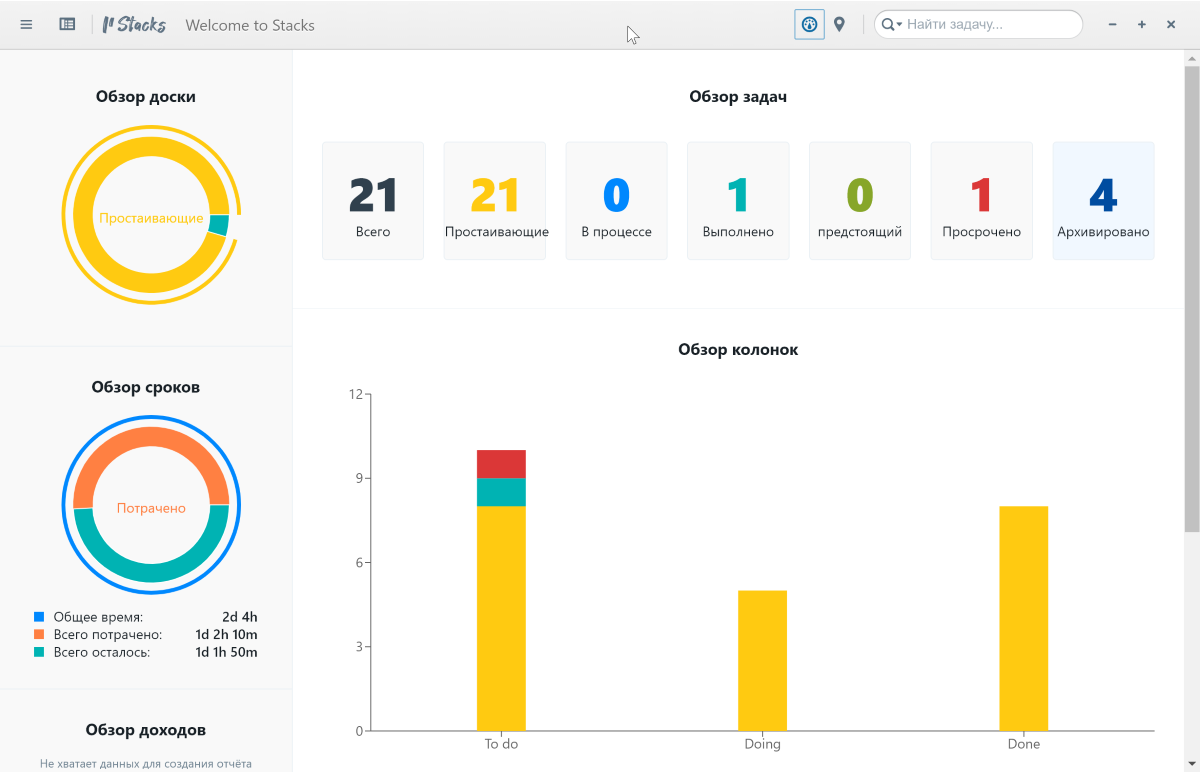 В Stacks есть два дополнительных дашборда. Первый со сводной статистикой по текущей доске.
