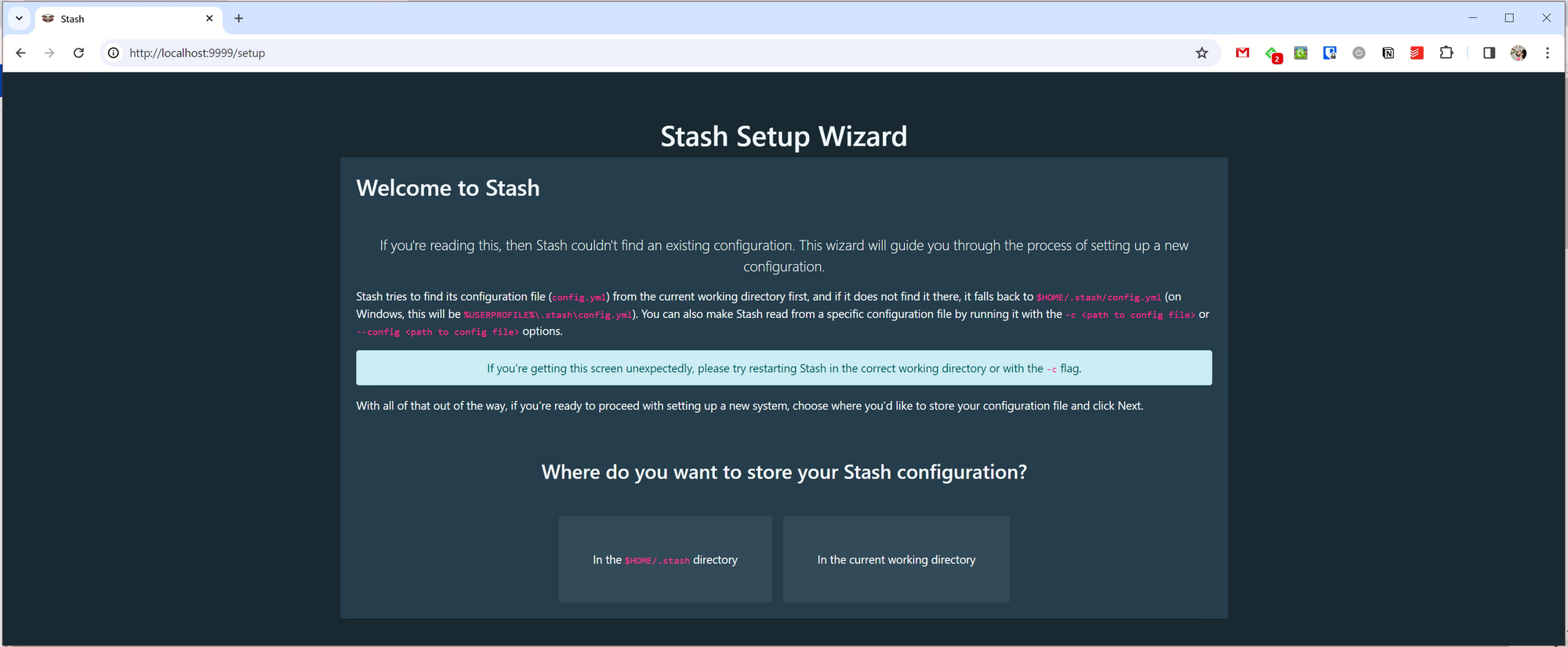 На экране выше предлагается установить приложение в директорию $HOME\.stash по умолчанию или в текущую рабочую директорию (на Windows это %USERPROFILE%\.stash\). В целом выбор пути не имеет значения. В первом случае приложение установится для всех пользователей системы, а во втором — только для вас.