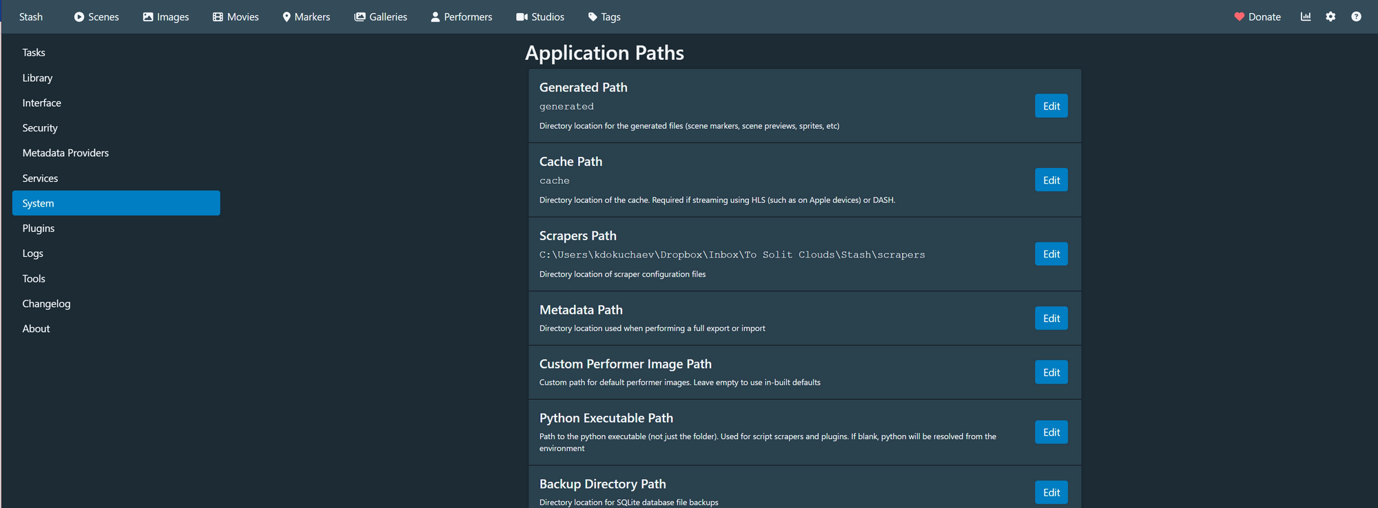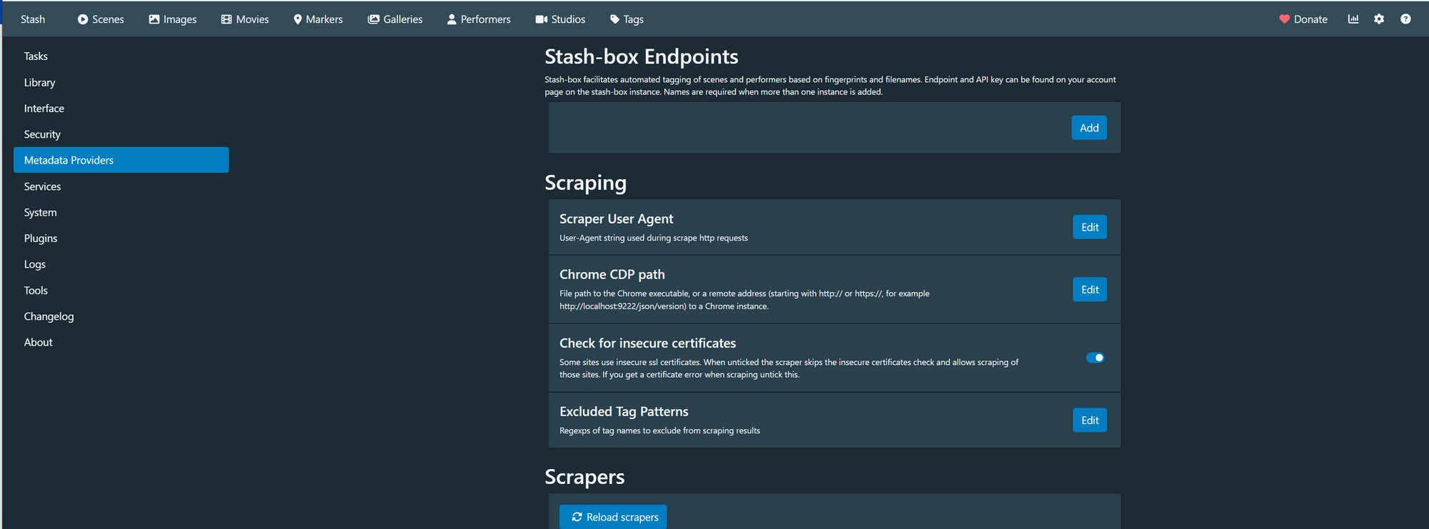 Ещё один важный шаг — установка скрейперов, с помощью которых Stash сможет подтягивать информацию о фильмах, актёрах и превьюшках. Процесс достаточно нетривиальный, ведь установка происходит через редактирование файла scrapername.yml в папке с приложением.