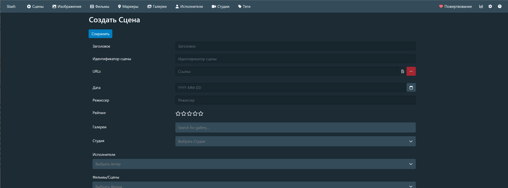 Содержимое полей для заполнения также зависит от типа добавляемого контента. Так, для сцены это может быть её заголовок, ID, ссылка, рейтинг, студия, актёры и прочее. Конечно, поддержка тегов — на месте.