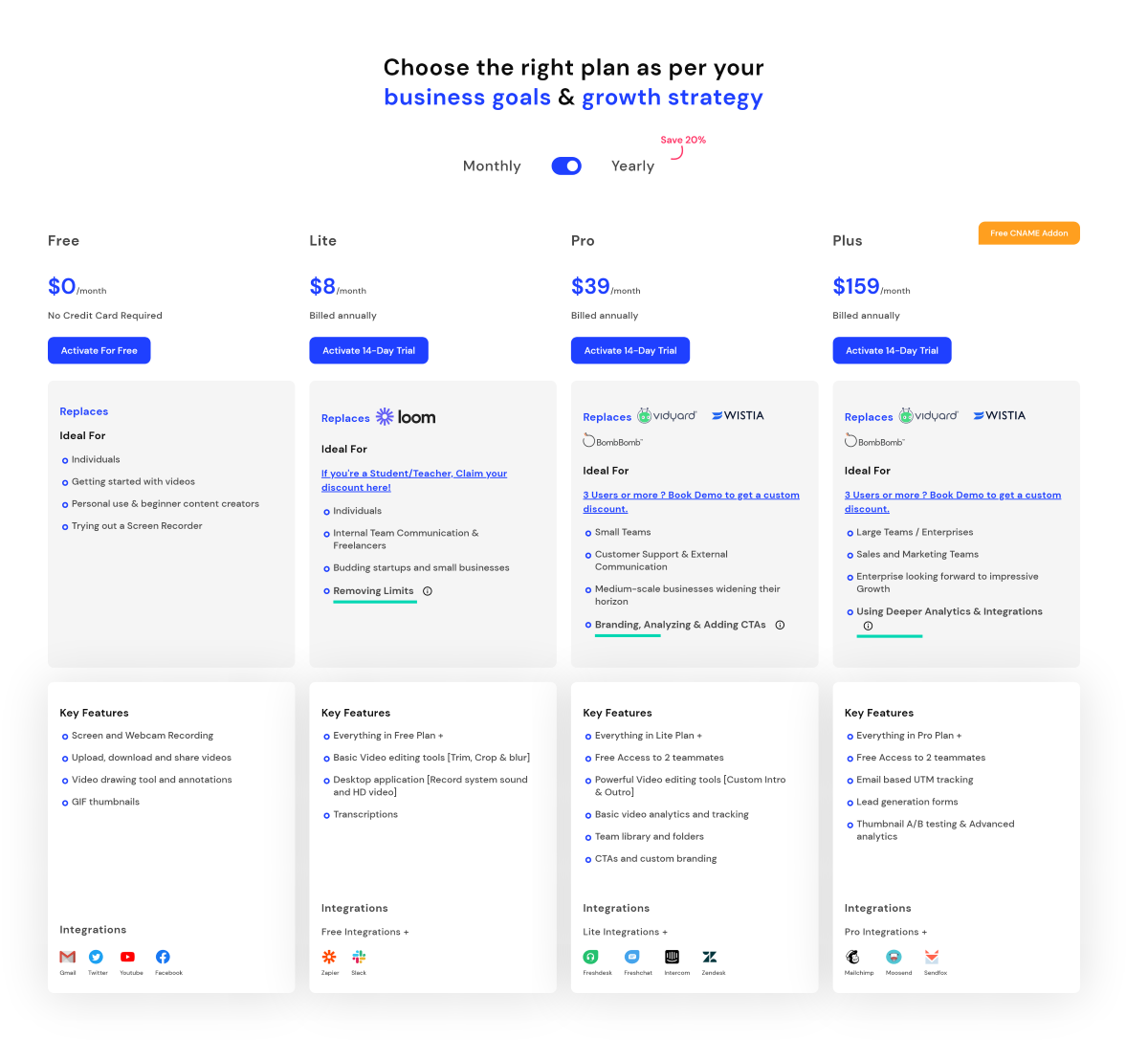На бесплатном тарифе у вас есть возможность пользоваться расширением для записи скринкастов, хранить их на серверах сервиса, встраивать на свой сайт и добавлять метки к видео.