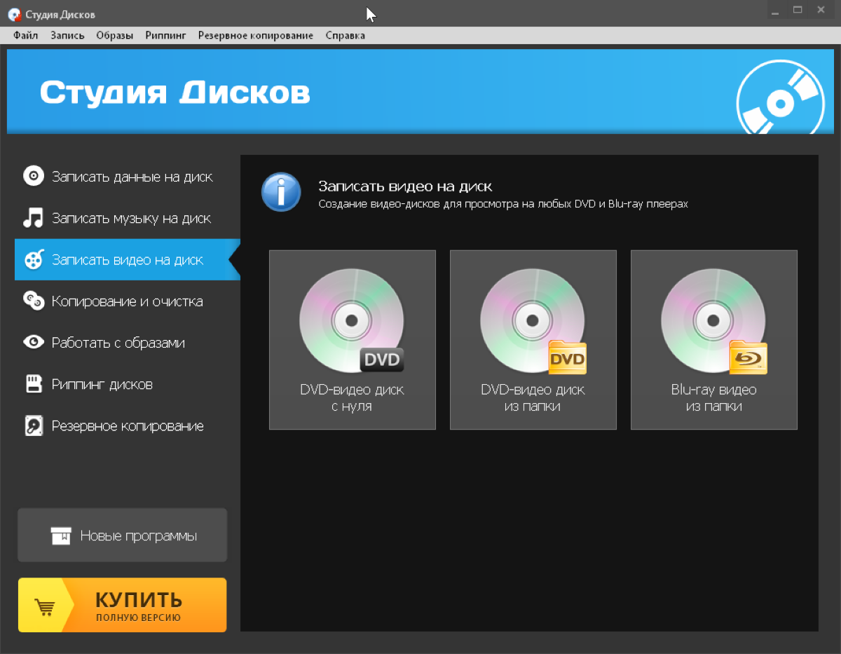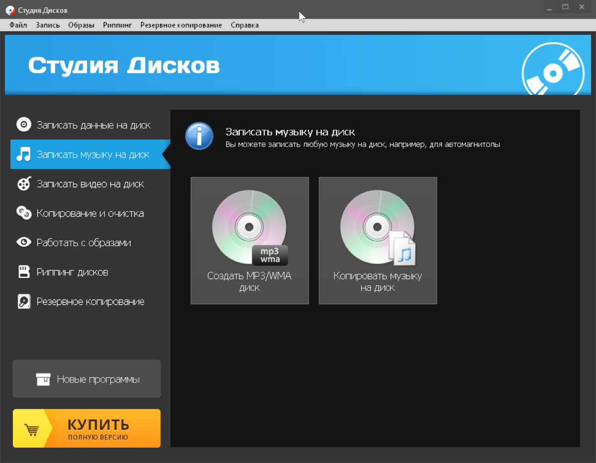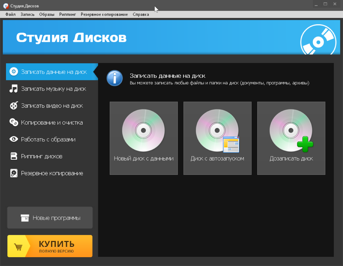 Студия Дисков — русскоязычное приложение для Windows, которое поможет записать диски различных типов.