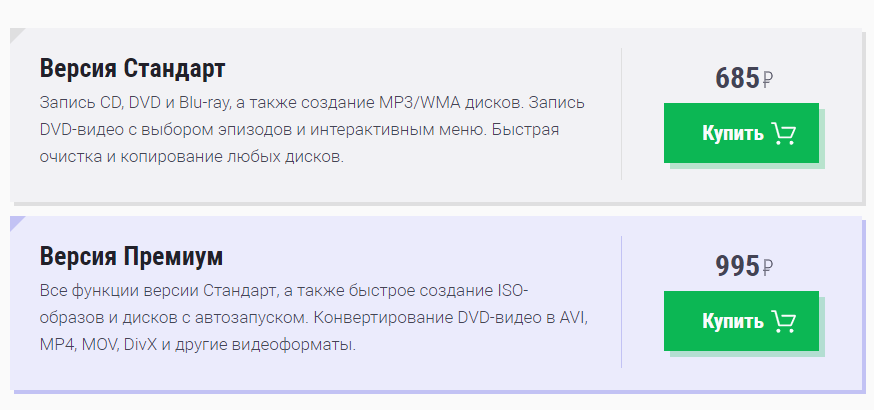 Студия Дисков поставляется в двух вариантах. В версии Стандарт за 685 рублей закрыты возможности создания образов дисков, загрузочных дисков и конвертации DVD.
