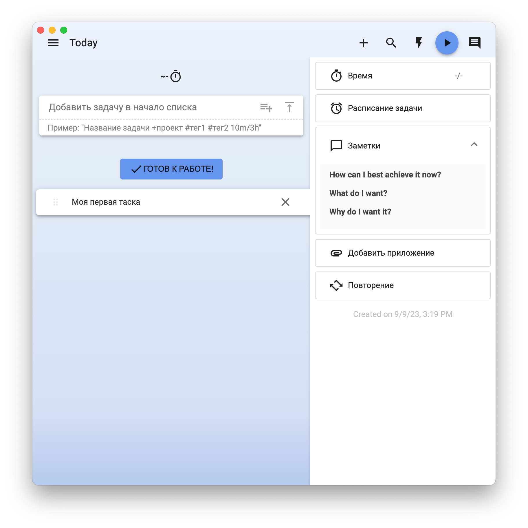 При добавлении задач можно их назначать сразу же в проекты, добавлять теги и время. Всё это из строки ввода. Либо можно перейти в редактор задачи и добавить все необходимые параметры, включая заметки, вложения и прочее.