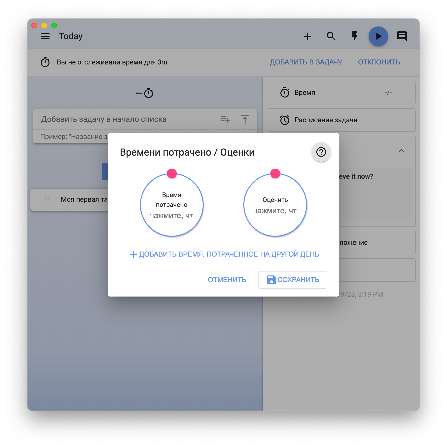 При указании времени на выполнение задачи есть два пункта: запланированное время и фактически затраченное. Во втором случае его можно ввести вручную или при запуске таймера у выбранной таски.