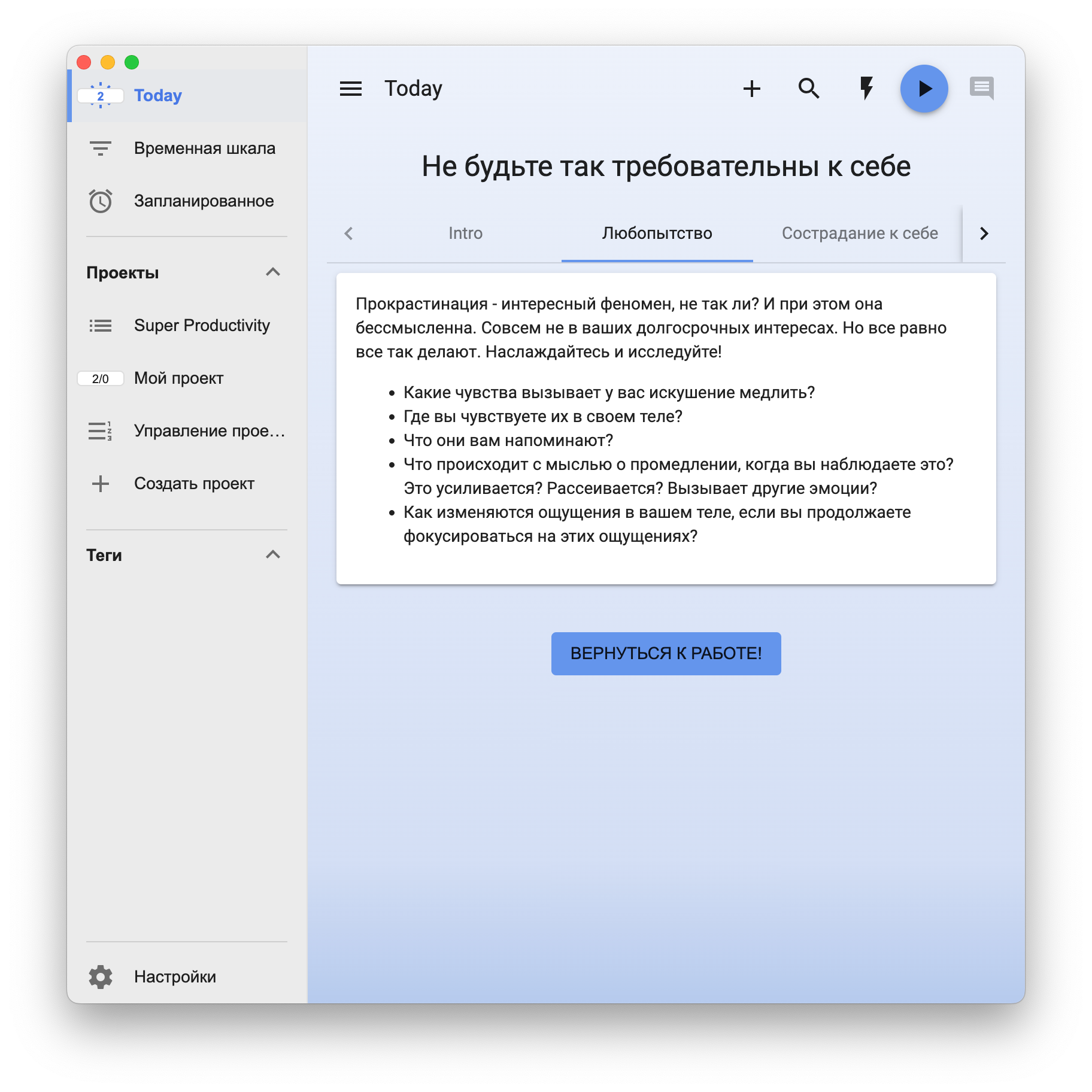 Для этого даже есть ещё один раздел для прокрастинаторов. При клике на иконку-молнию вас ожидает небольшая статья по теме проблемы и небольшой опросник. Саморефлексия во все поля.
