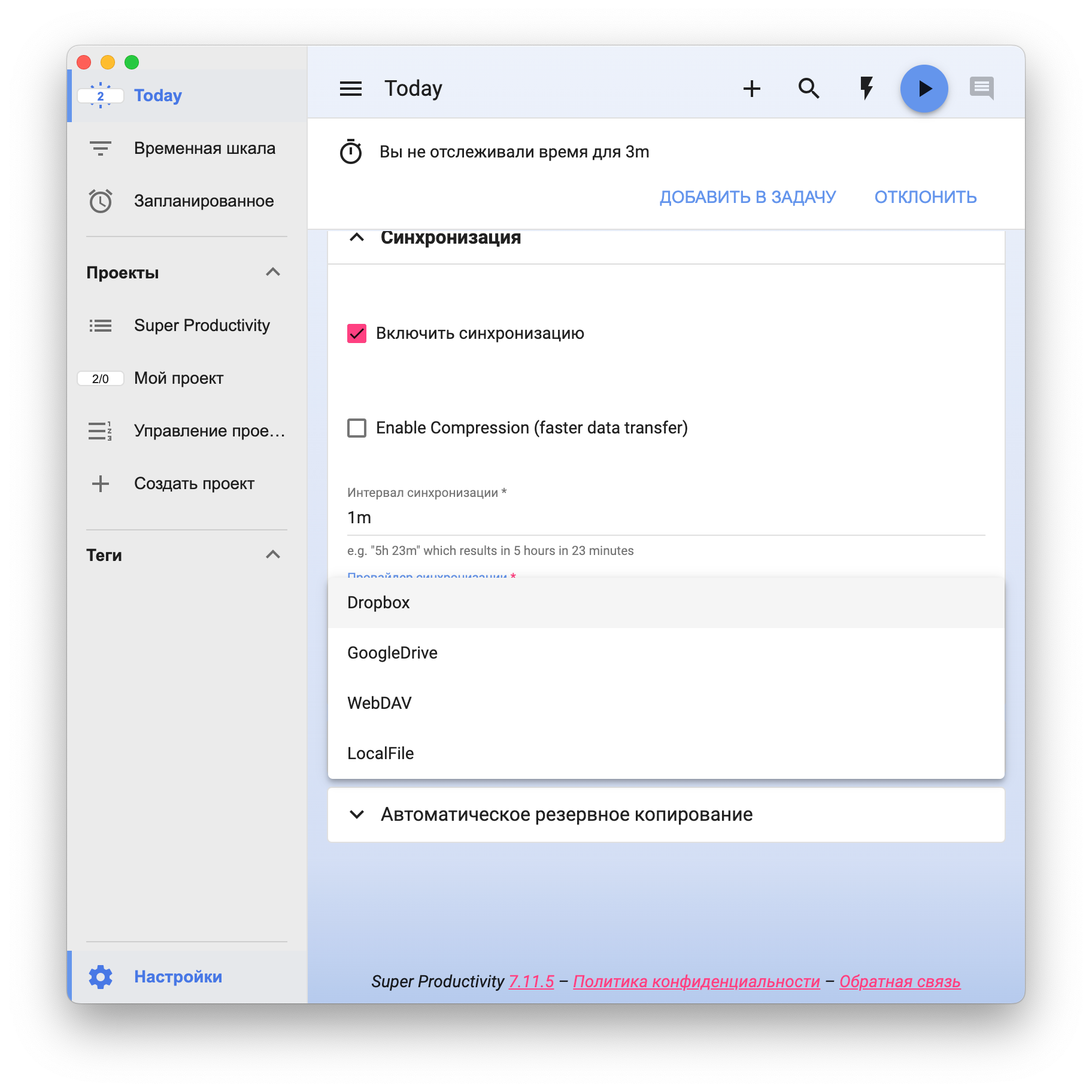 Как вы могли заметить в начале статьи, приложение не требует регистрации. Как же тогда работать за разными компьютерами и на мобилках? Всё просто. В настройках можно включить синхронизацию через ваше собственное облако или Dropbox, Google Drive, WebDav, локальный файл.