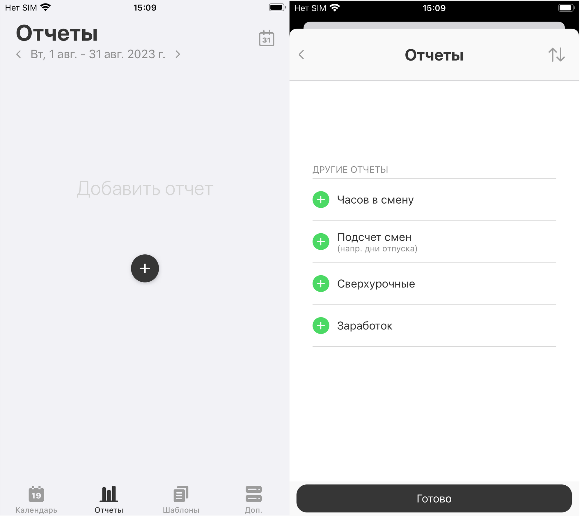 В этом разделе можно создавать и просматривать отчётность по часам в смене, подсчёт смен, расчёт сверхурочных и общего заработка.