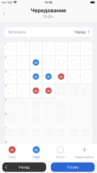 Готовые смены можно расставить по календарю в разделе Чередование. Именно здесь вы указываете, в какой день какая смена вам предстоит.