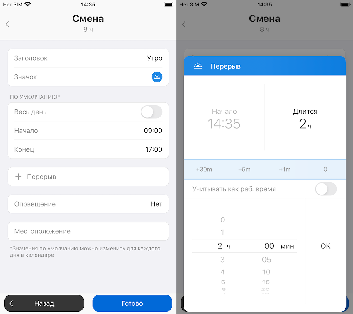 Для расписания поддерживается 24-х часовая смена или указание конкретного времени начала и окончания. Отдельно добавляются перерывы: можно указать время начала перерыва и длительность. При этом перерыв можно включить в рабочее время, а можно исключить. Также можно добавить оповещение и указать местоположение.