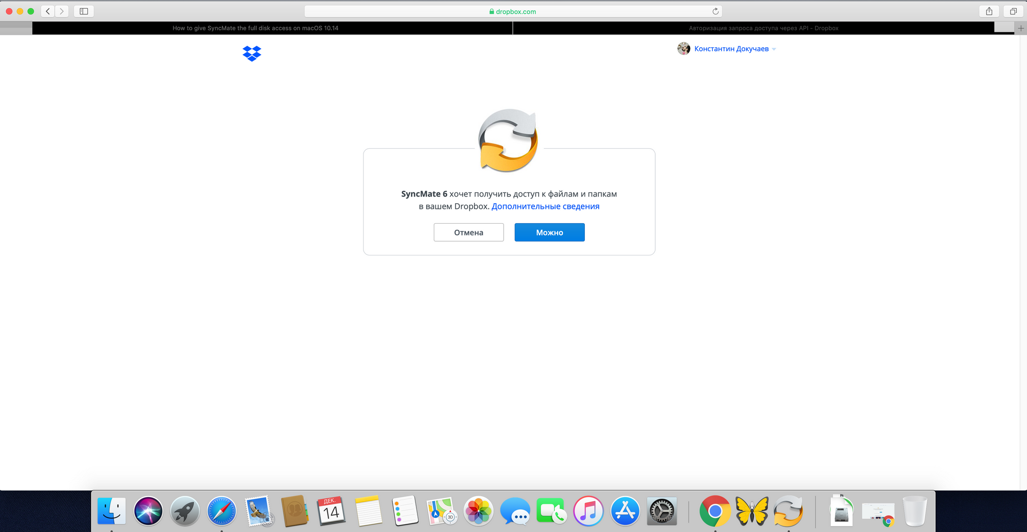 При нажатии на иконку Dropbox откроется браузер со стандартным предложением авторизации в аккаунте и разрешения доступа SyncMate к облаку.