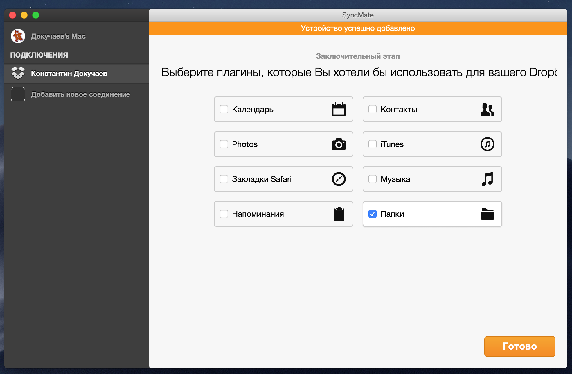 После авторизации в SyncMate нужно выбрать плагины, которые будут использоваться при синхронизации с Dropbox. Поскольку я хочу синхронизировать папки, то мне и нужен только плагин «Папки».