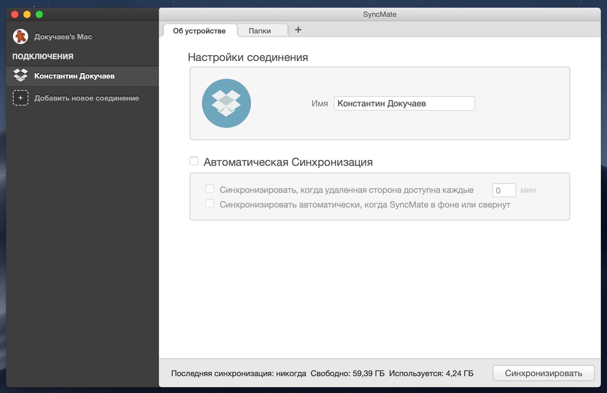 Для каждого типа шаги настройки будут немного отличаться, но сложностей не должно возникнуть. Интерфейс SyncMate полностью русифицирован и не вызывает трудностей при настройке.
