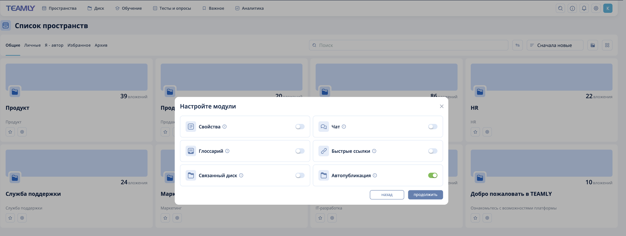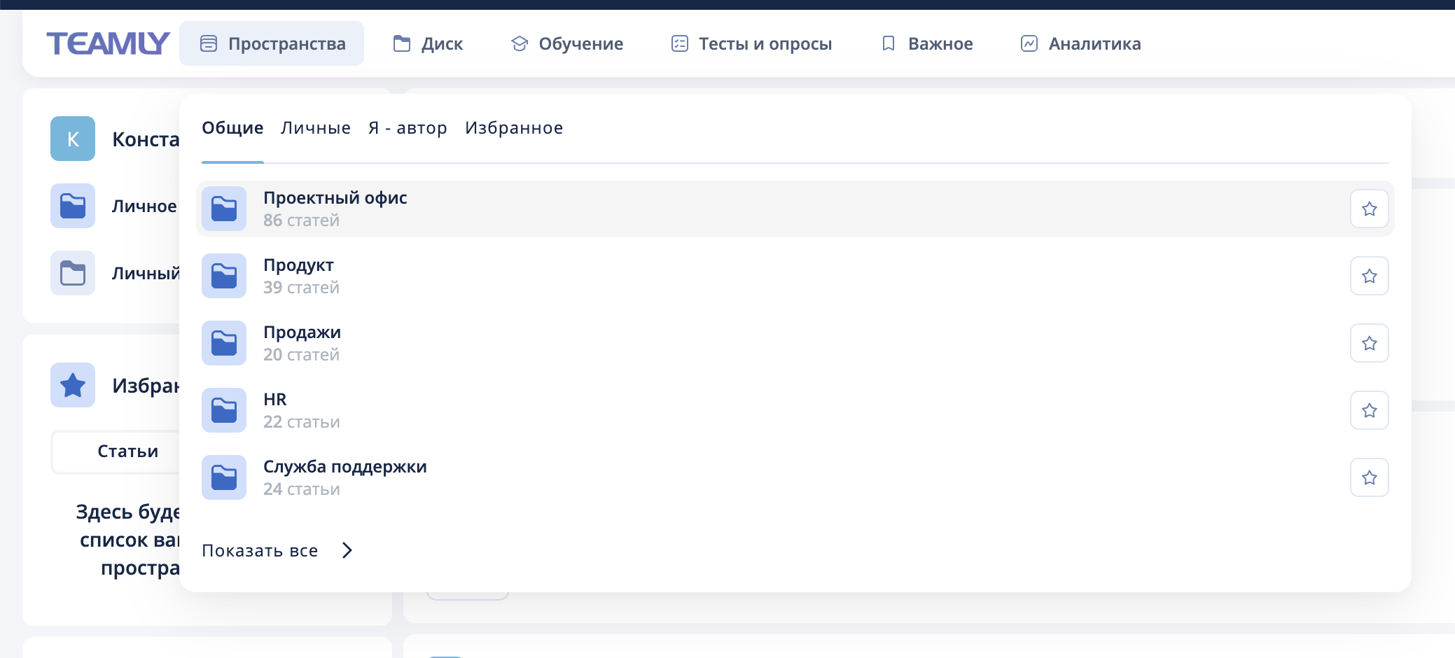 В каждом из таких пространств уже будет создана какая-то дефолтная структура с примером статей, которые одновременно являются обучающим материалом.