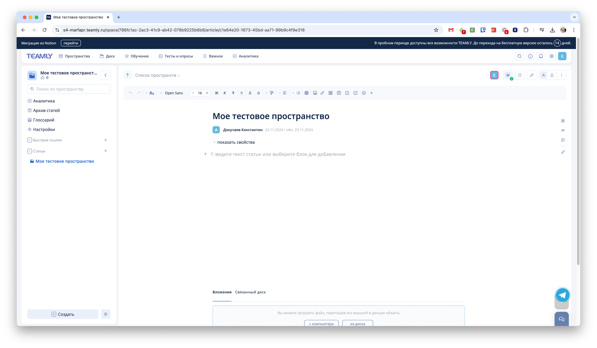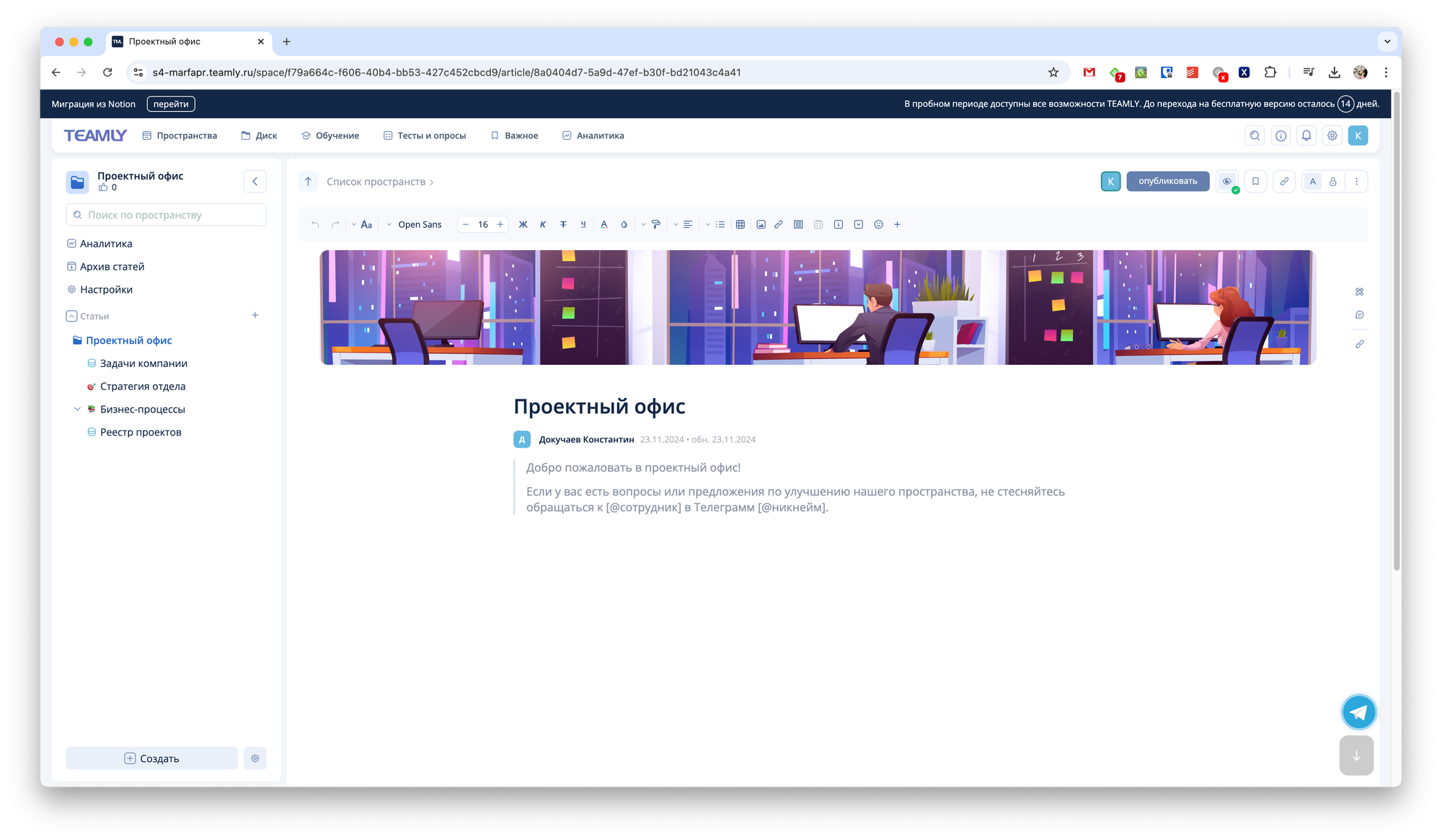 Само пространство скорее будет знакомо пользователям Confluence, чем Notion. На левой панели есть навигация по статьям, архиву и глоссарию.