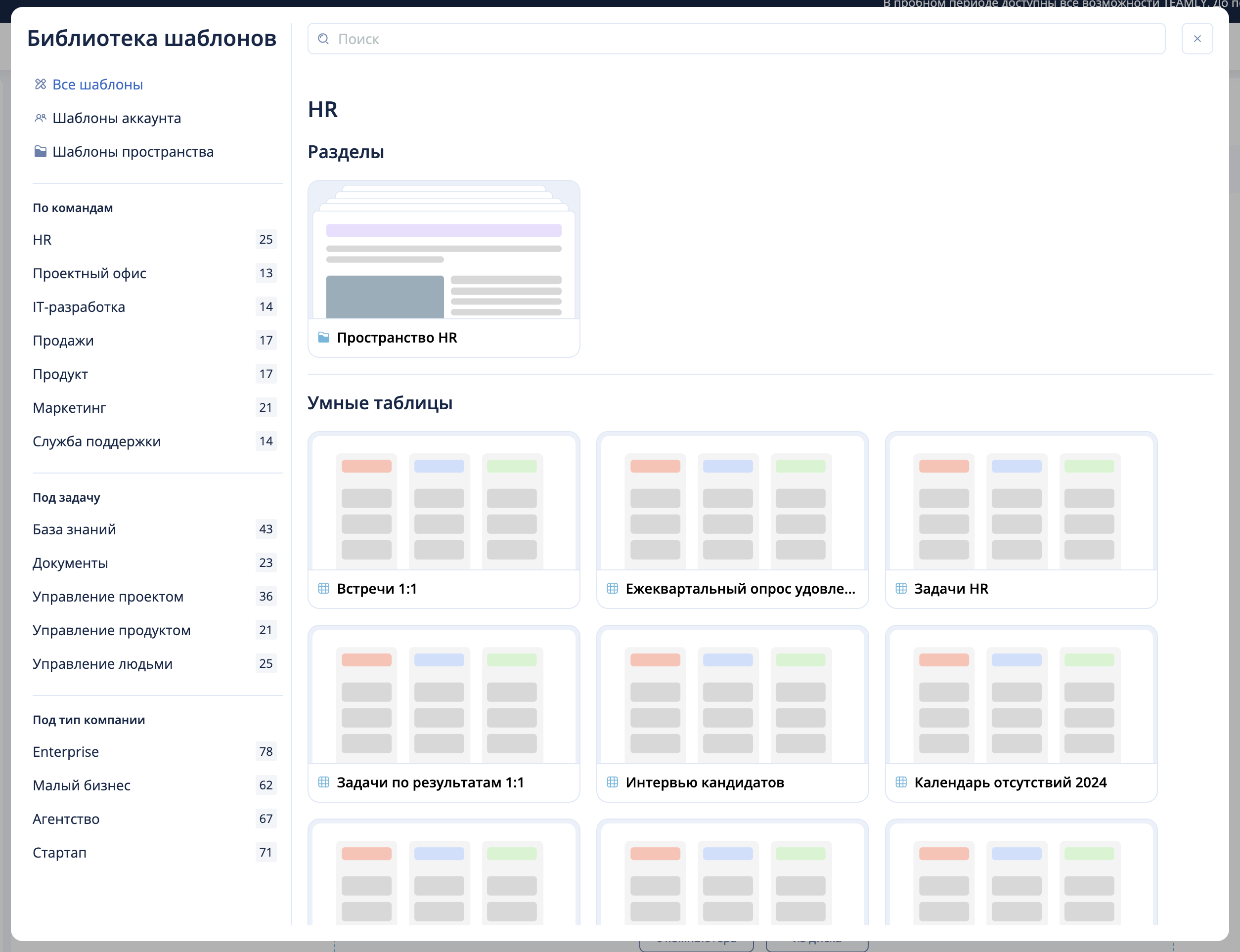 Внутри проекта по умолчанию можно создавать несколько типов статей: обычная статья, интеллект-карта, умная таблица и интерактивная доска. Но в библиотеке шаблонов гораздо больше — под самые разные задачи.