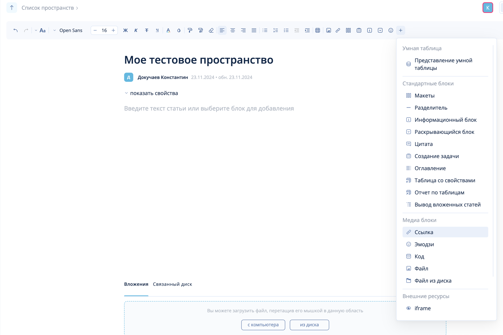 Файлы, кстати, можно загружать как с компьютера, так и из общего облачного диска компании. А при работе с документами поддерживается совместное редактирование и комментирование.