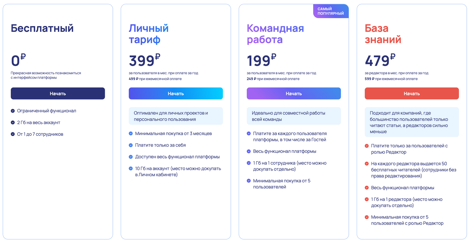 Есть как бесплатные тарифы для команд до семи человек, так и платные стоимостью до 479 рублей в месяц за пользователя. Если говорить про платные тарифы, то между ними нет особой разницы, и вы в любом случае получите все возможности сервиса в своё полное распоряжение. Основная разница — количество гигабайт в облаке.
