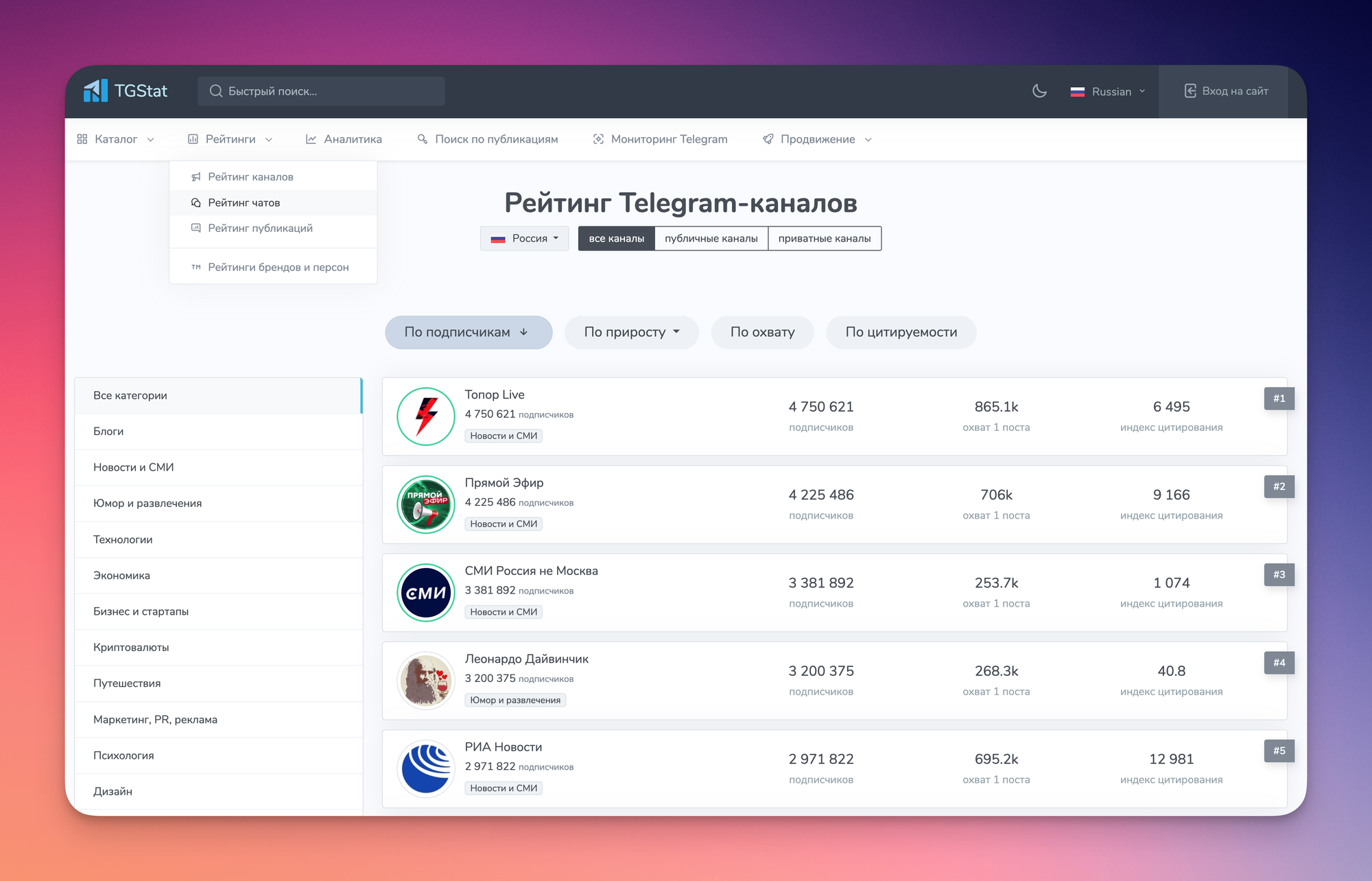 Как и прежде, всю информацию можно отфильтровать по категориям, гео, типам каналов. Также можно сменить сортировку рейтинга по нужным параметрам.