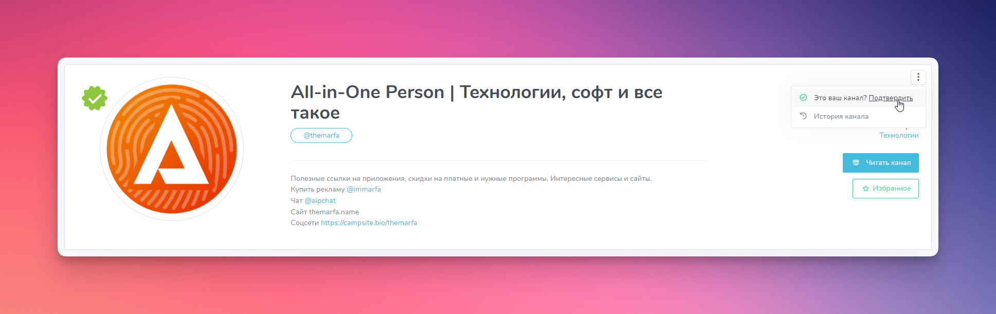 Владельцы каналов после авторизации в сервисе могут найти свой канал и подтвердить, что он ваш.