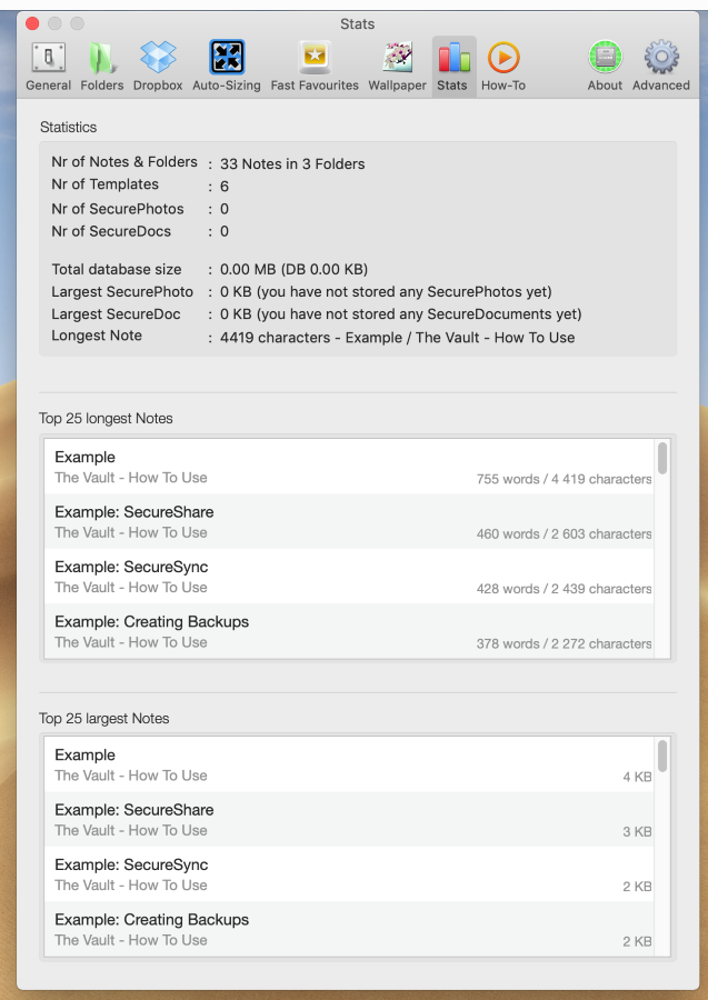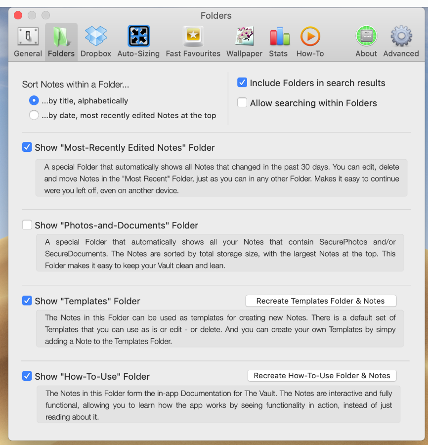 В The Vault можно тонко настроить практически каждый параметр приложения. Среди настроек есть параметры вёрстки заметок, параметры папок, статистика сохранённых данных и параметры внешнего вида приложения.