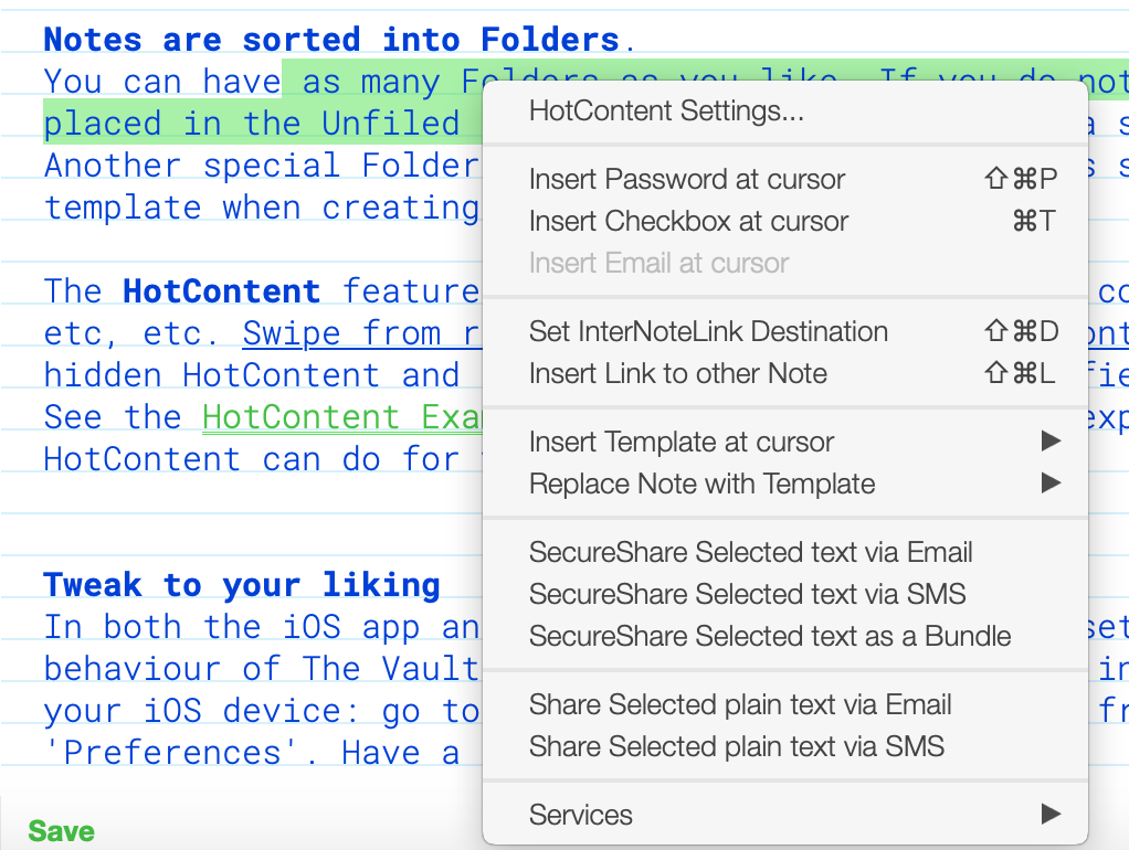 На iOS поддерживается функция AutoFill, что позволяет использовать The Vault как полноценный менеджер паролей. Для корректной работы рекомендуется использовать соответствующий шаблон заметки.