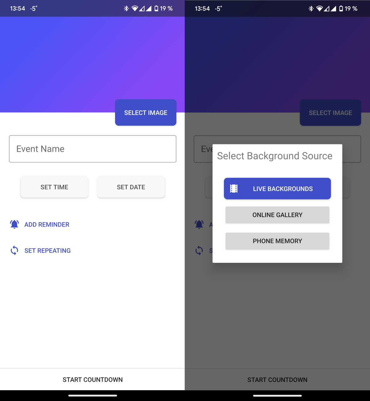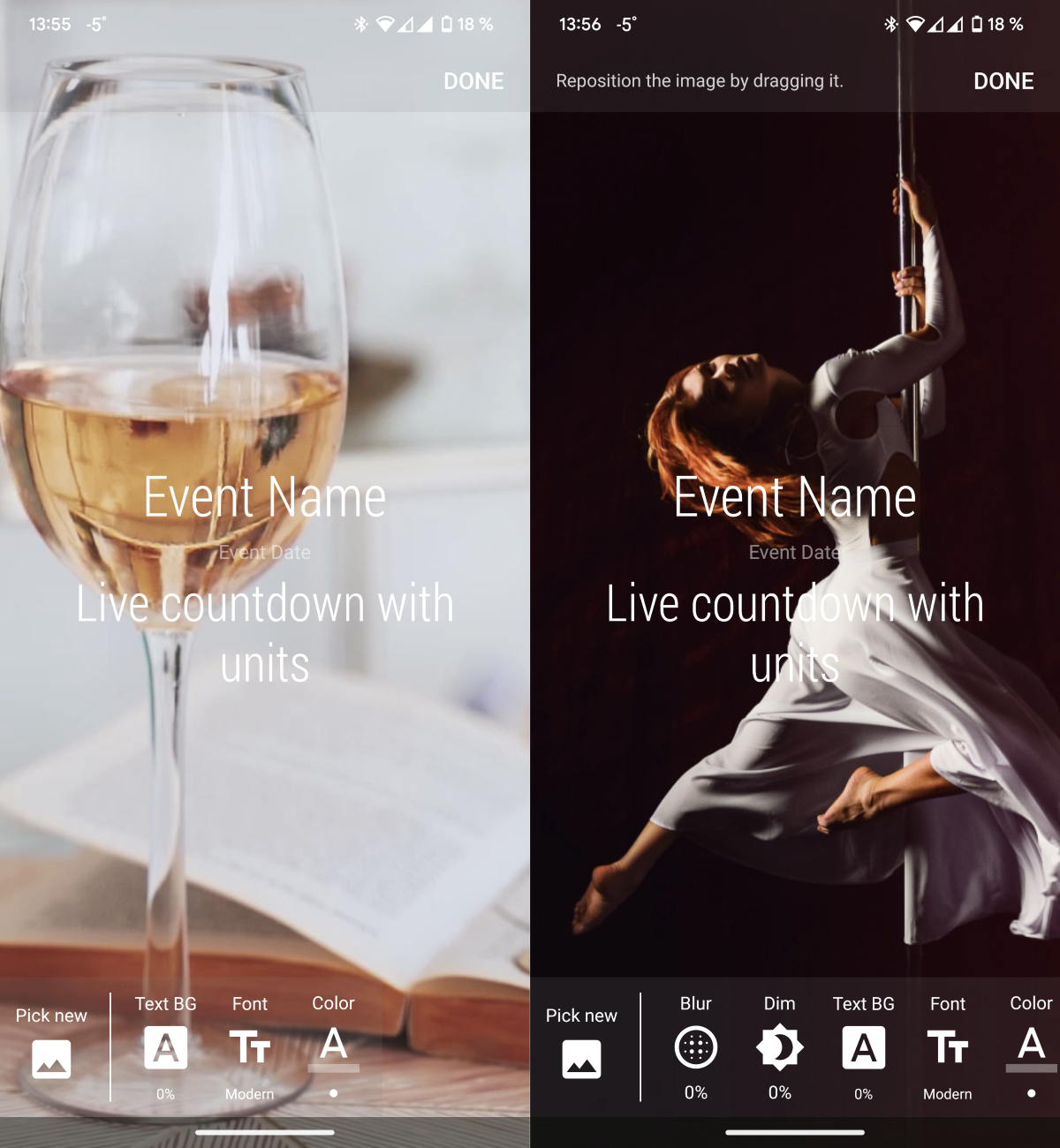 На главном экране Time Until происходит вся кастомизация предстоящих или даже прошедших событий (если вы хотите знать, сколько времени прошло). На первом шаге можно выбрать фоновую статичную или живую картинку из встроенной галереи. Если изображения не зашли, можно выбрать из памяти смартфона.