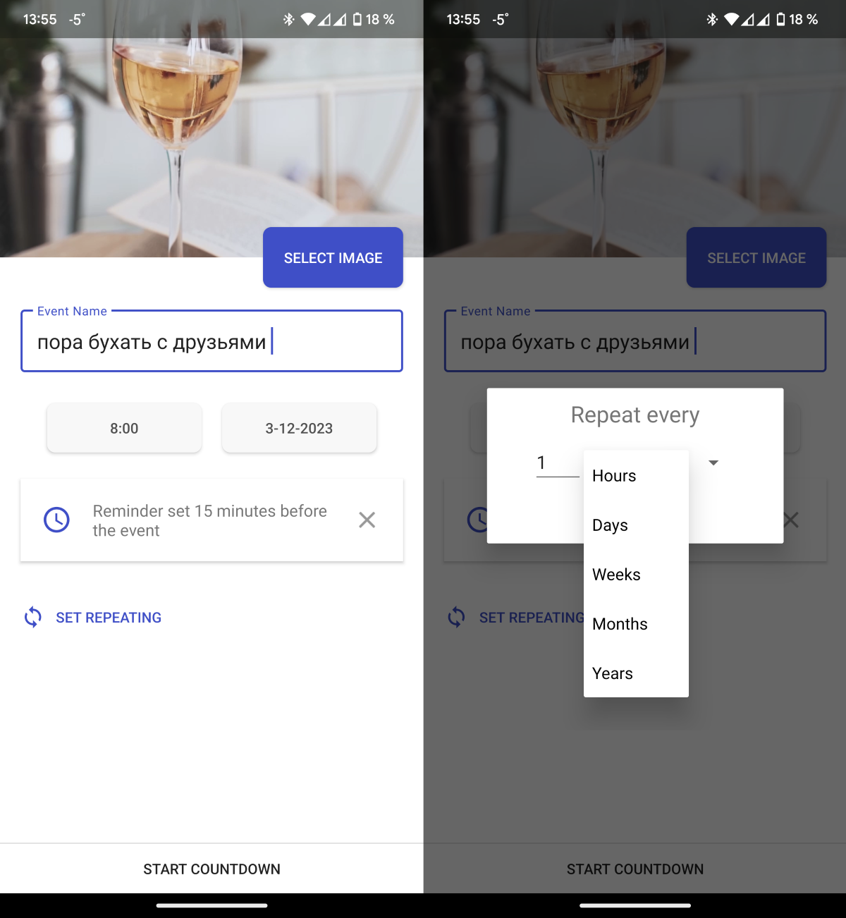 Затем можно указать название события и точное время до его наступления. Дополнительно можно задать повторяемость и напоминание за 15 минут до даты X.